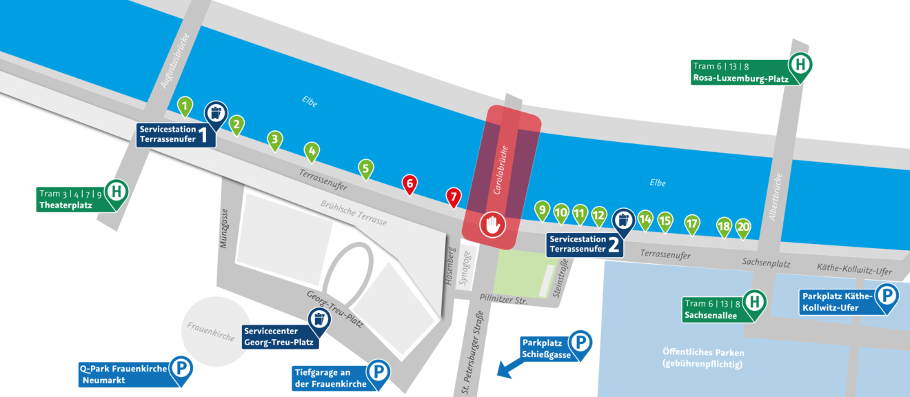 Das Terrassenufer in der Dresdner Altstadt ist aufgrund seiner zentralen Lage gut mit verschiedenen Verkehrsmitteln oder zu Fuß erreichbar. Die Anleger der WEIßEN FLOTTE SACHSEN befinden sich zwischen der Augustus- und der Albertbrücke. Eine Übersicht der einzelnen Anleger sowie Informationen zu Parkmöglichkeiten und Haltestellen finden Sie auf der folgenden Karte.